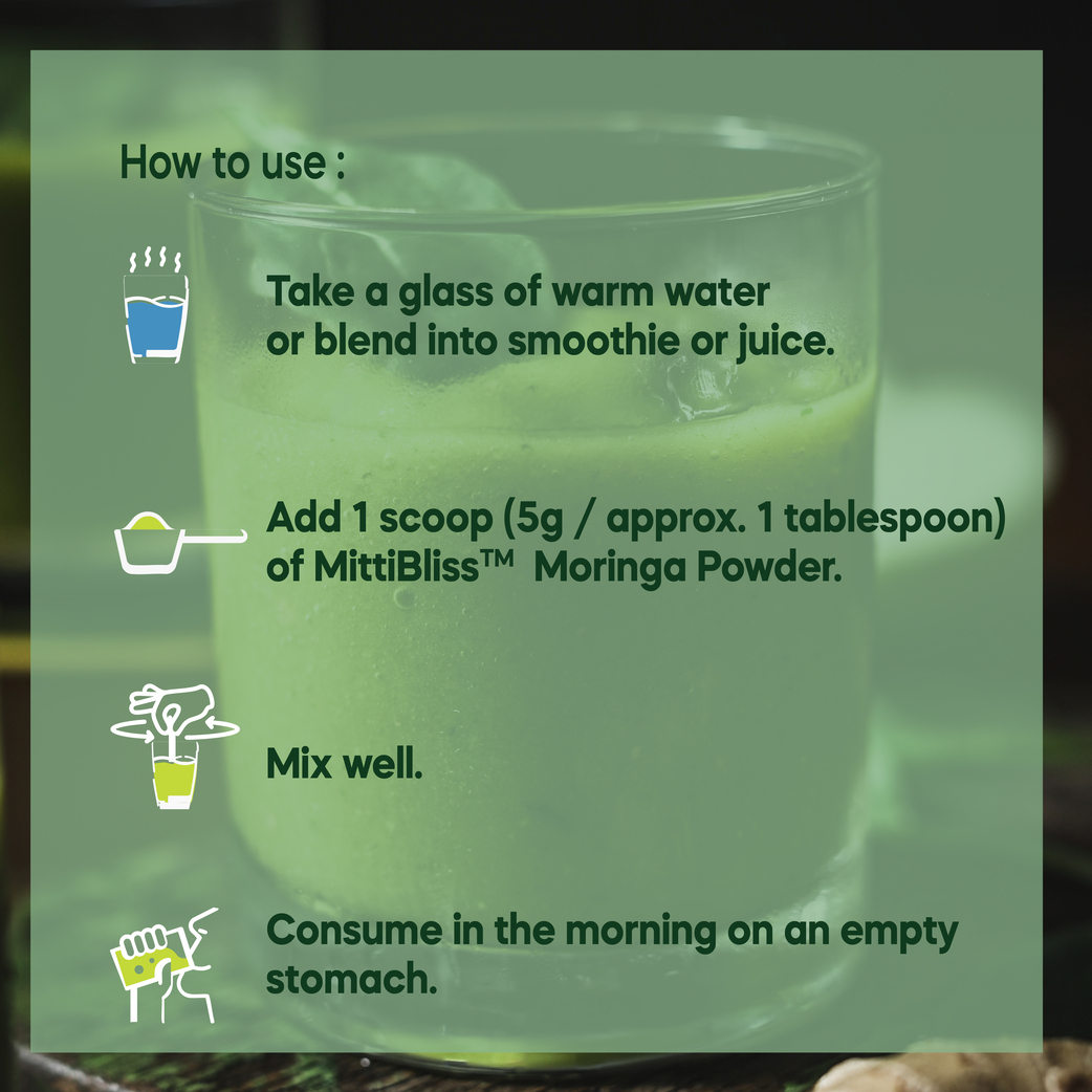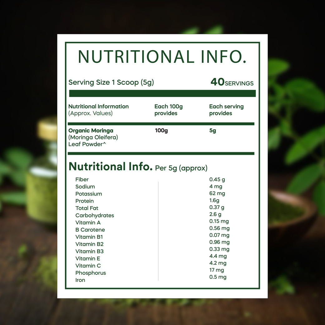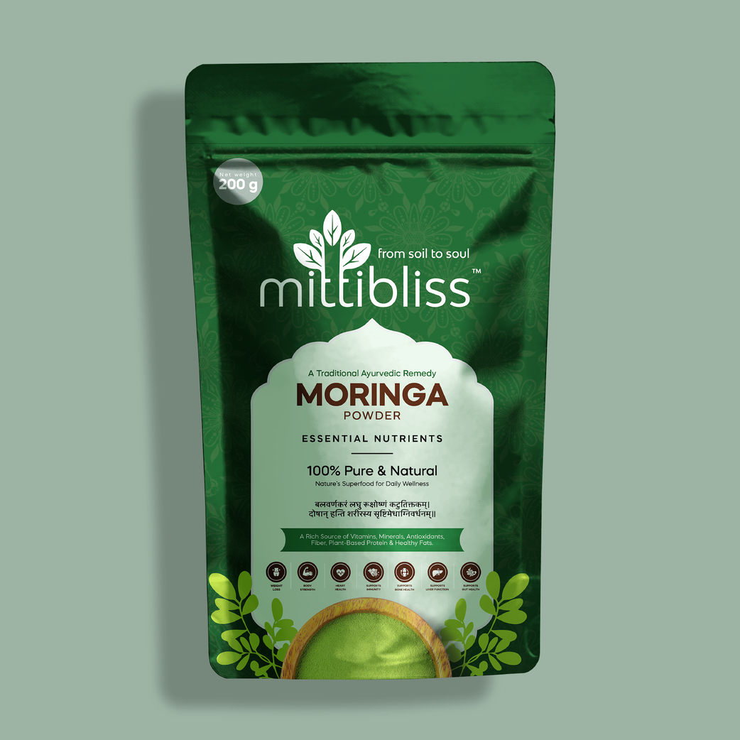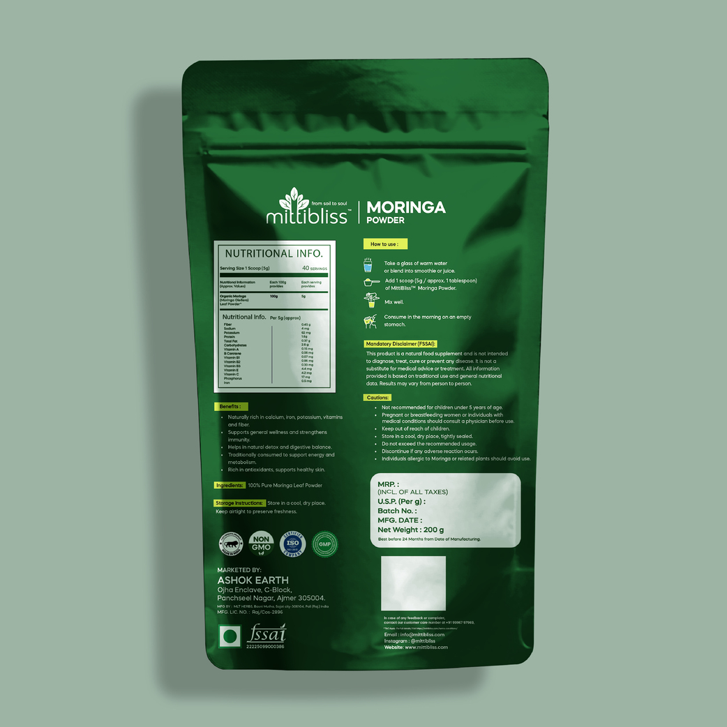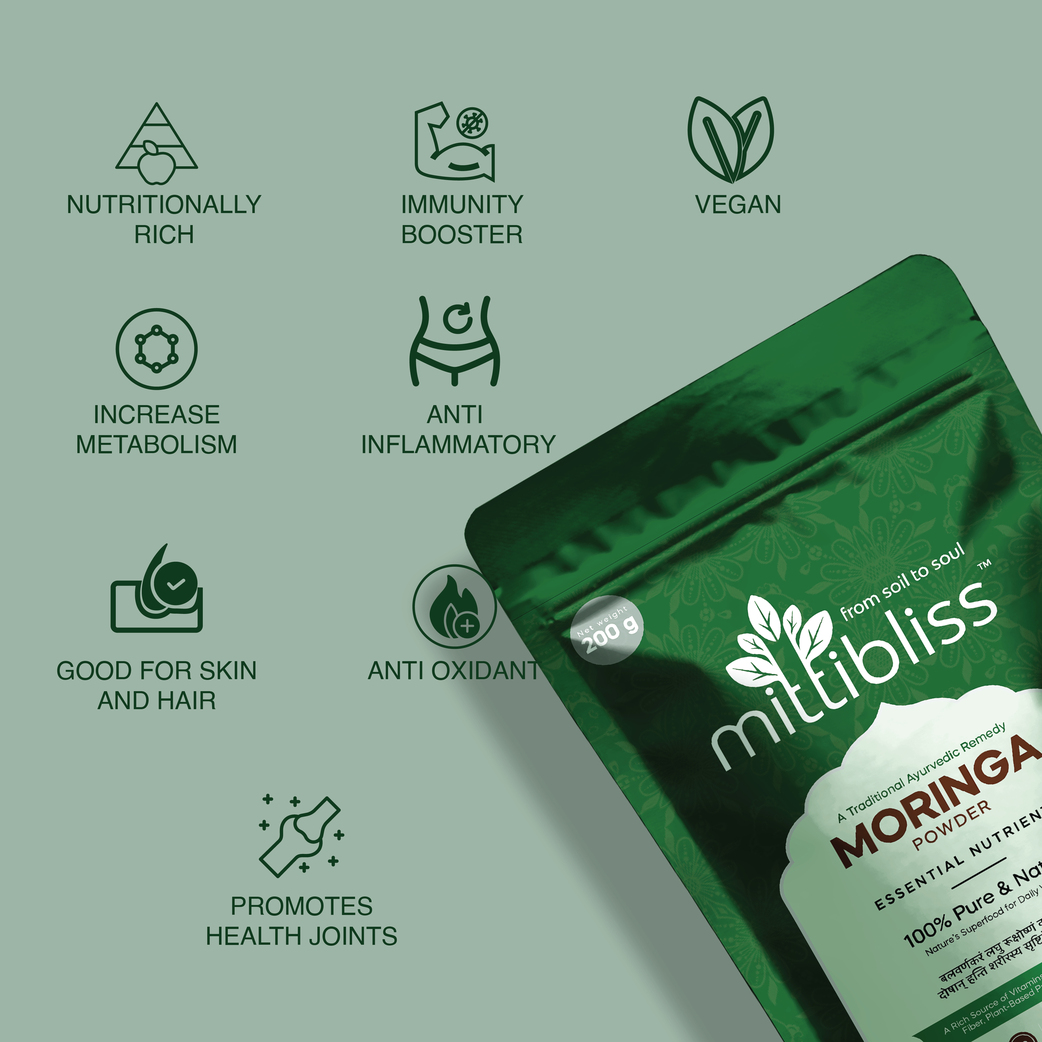 Pure Moringa Powder (Moringa oleifera) powder is made of the ground leaves of the moringa tree, a beloved drought resistant plant that has been used in Ayurveda for thousands of years. Also referred to as the drumstick tree because of the long and twisted seed pods it produces, moringa has a rich history across India and throughout the world due to its reputation as a miracle tree. Historically, various parts of the moringa tree have been used for everything from building materials, to water filtration, to traditional medicine, and everyday use as a nutrient-dense food source. In classic Ayurvedic texts, moringa is called “sigru,” which means “moves like an arrow,” alluding to the herb’s ability to rapidly penetrate the tissues of the body to instigate deep cleansing and restoration.